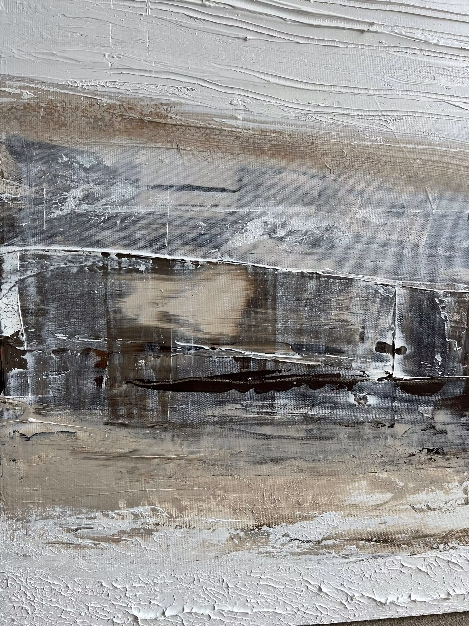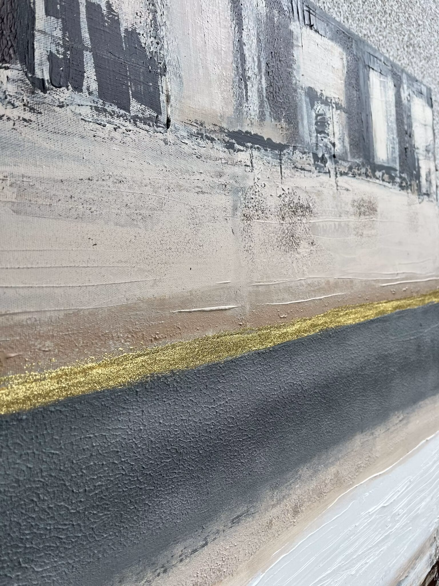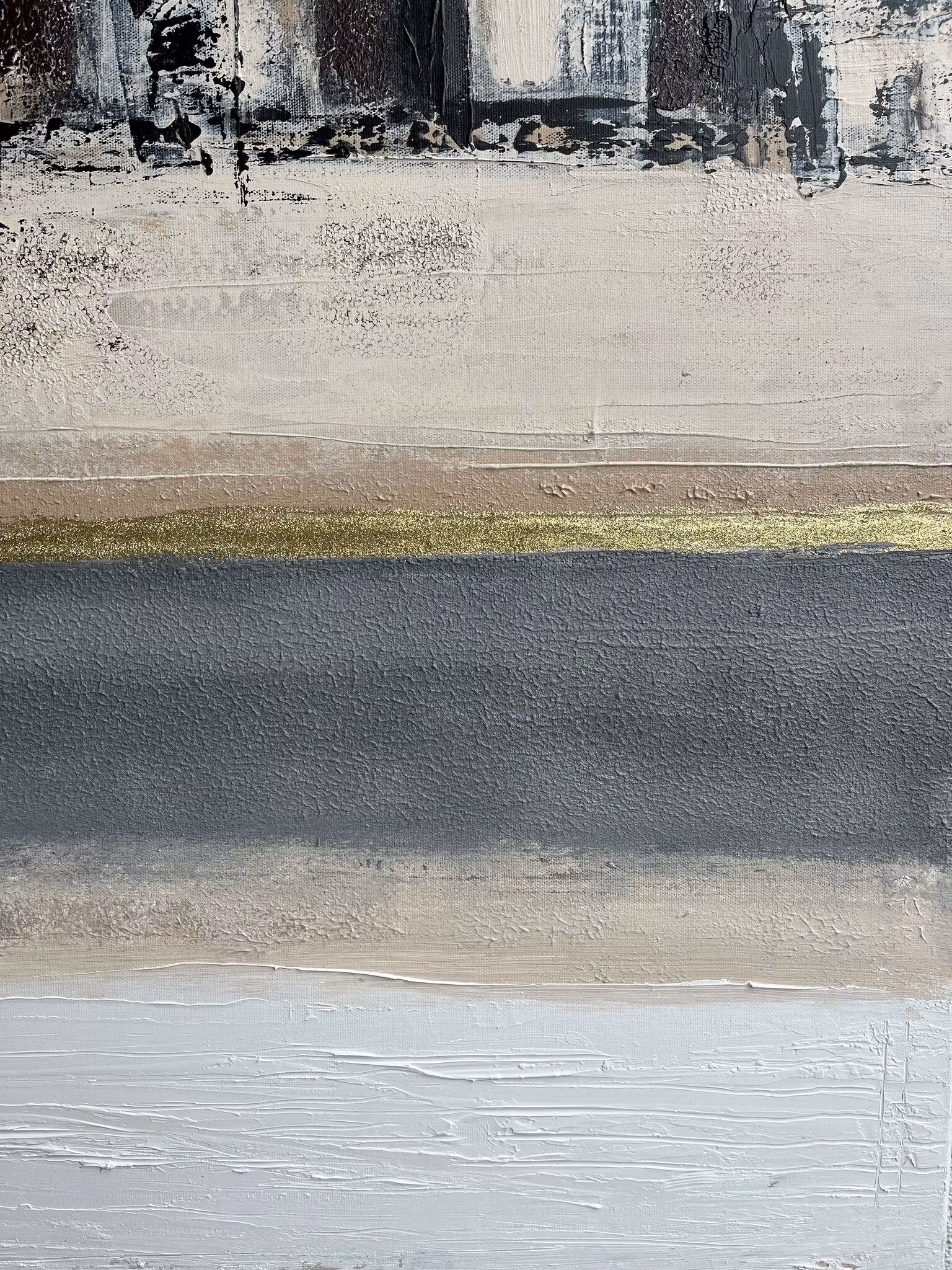 I kontrast till de varma och jordnära nyanserna löper en tunn, glittrande linje i guld genom verket, som gyllene tråd som binder samman dom jordnära färgerna.