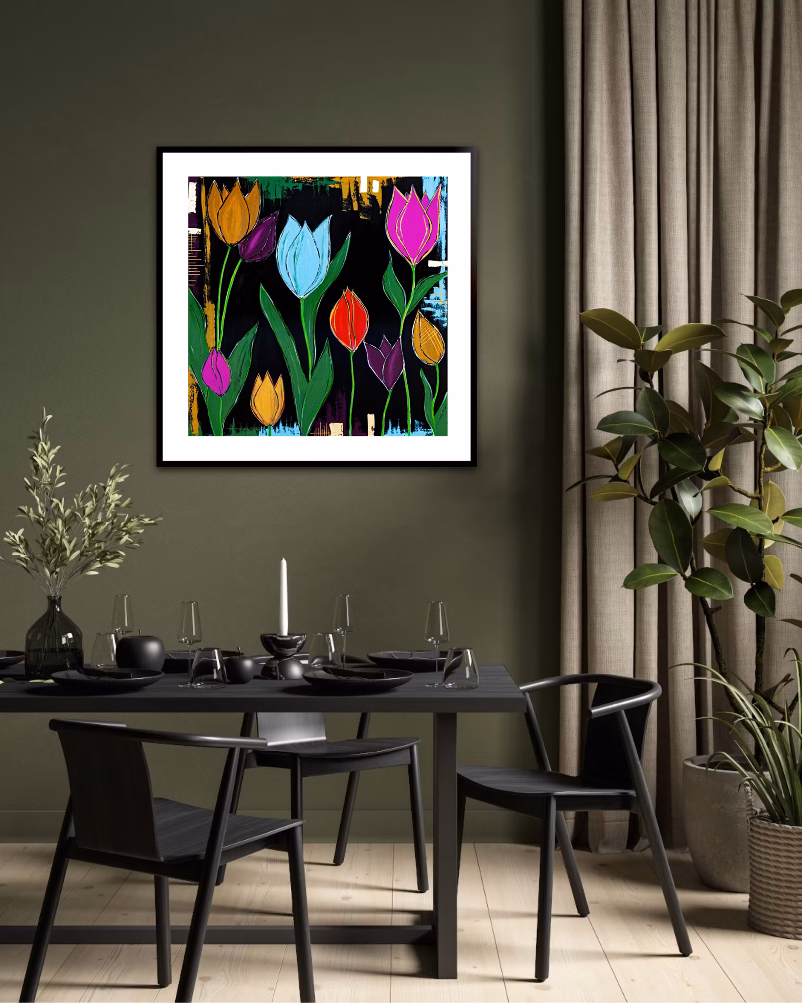 TULPANSKOGEN påminner oss om att uppskatta det vackra, även när det är kortvarigt. De färgglada och kraftfulla tulpanerna nästan dansar, dom har nyligen vaknat till liv. Den svarta bakgrunden fungerar som en dramatisk kuliss. Det finns en användning av guldfärger i verket. Guldets skimmer skapar en känsla av elegans. Motivet har en känsla av rörelse och liv, men det anas en kontrast mellan ljus och mörker, som gör den till en tänkvärd konstupplevelse. Tulpaner ses vid speciella tillfällen, som vårens ankomst eller i romantiska sammanhang.