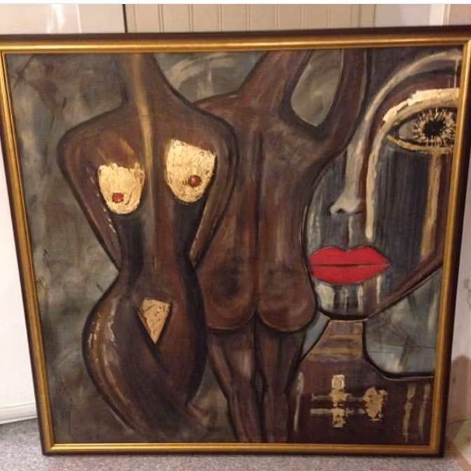 Om att var du än befinner dig så är det alltid någon som ser. Någon finns där. Man bevittnar både bra och dåliga saker i livet. Jag har målat med olika bruna nyanser och lite glänsande slagmetall på två kvinnliga platser.