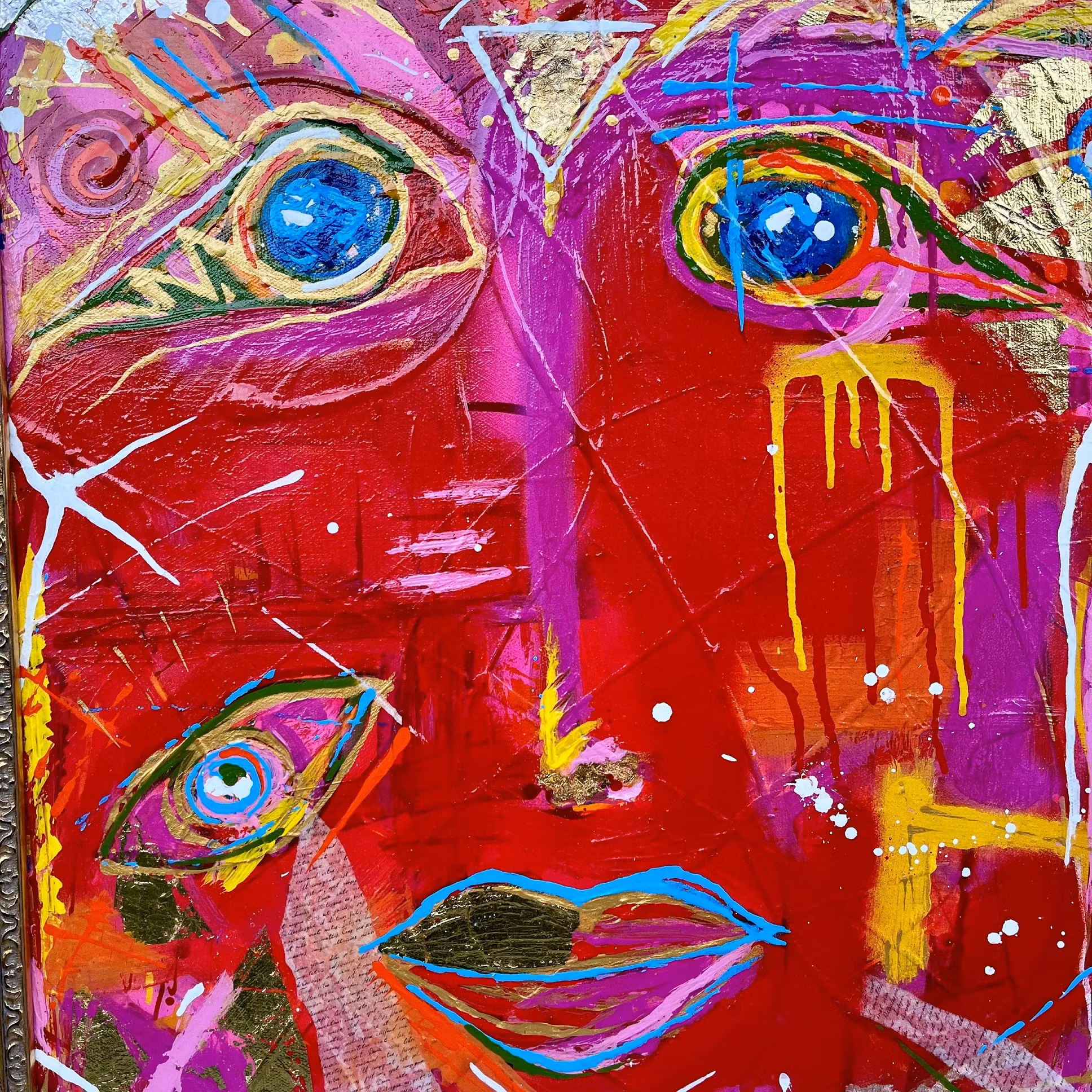 En färgstark och modern målning som har kombinerats med en historisk rokoko-ram, vilket skapar en kontrast mellan nutid och dåtid. Ramen, i rokoko-design, förstärker lekfullheten i verket, och ger en skön känsla av tidlöshet. Den intensivt röda färgen, fernissad med en hög glans gör att tavlan dominerar i rummet.